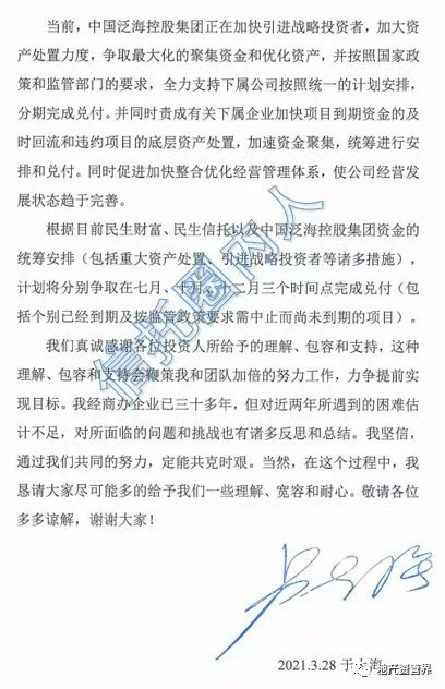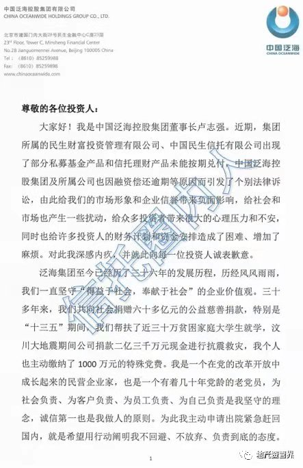 近日,中國泛海控股集團(簡稱“泛海控股”)董事長盧志強發布了一封“致投資人函”,進一步證實了民生財富、民生信托的暴雷傳聞。