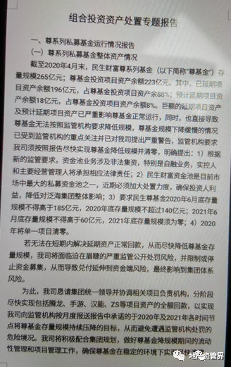 “截止到2020年4月末,民生財富尊系列基金存量規模265億元;尊基金投資項目資產余額223億元。其中,已延期項目資產余額196億元,占尊基金投資項目資產余額88%;預計延期項目資產余額18億元,占尊基金投資項目資產余額8%。巨額的延期項目資產及預計延期項目資產已嚴重影響尊基金正常運行,同時,也直接導致尊基金無法按照監管要求降低規模,尊基金規模下降緩慢的情況已受到監管機構的重點關注并已對我司提出嚴重警告,監管機構要求我司須按照報告盡快實現尊基金降低規模并清零?!?/p>