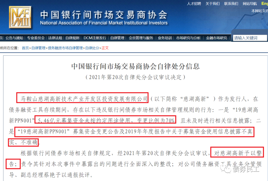 根據(jù)中國銀行間市場交易商協(xié)會(huì)2021年12月16日的公告信息,馬鞍山慈湖高新技術(shù)產(chǎn)業(yè)開發(fā)區(qū)投資發(fā)展有限公司因?yàn)椤?9慈湖高新PPN001”未按照約定使用募集資金、募集資金變更公告信息不真實(shí)不準(zhǔn)確等原因,交易商協(xié)會(huì)對發(fā)行人予以警告。