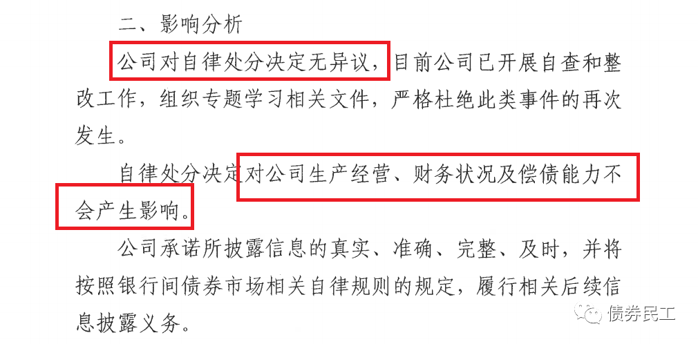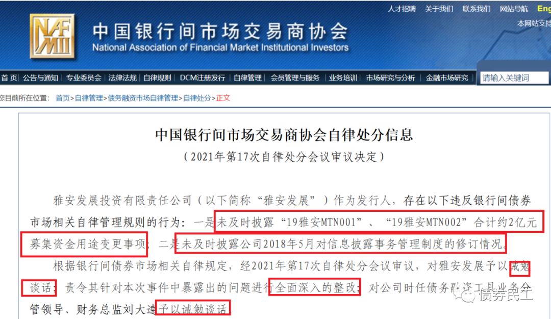 2、根據(jù)中國銀行間市市場交易商協(xié)會(huì)2021年10月29日披露的信息,雅安發(fā)展投資有限責(zé)任公司因未及時(shí)披露“19雅安MTN001”、19雅安MTN002”募集資金用途變更、未及時(shí)披露對信息披露事務(wù)管理制度的修訂,被交易商協(xié)會(huì)自律處分。處分措施包括對公司的誡勉談話、全面深入的整改以及對高管的誡勉談話。