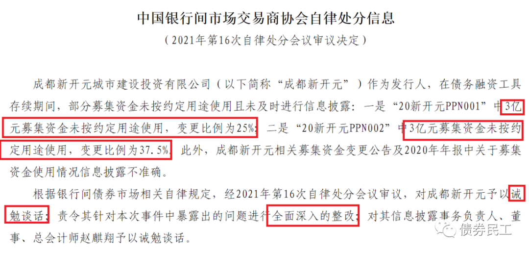 3、根據(jù)中國銀行間市市場交易商協(xié)會(huì)2021年10月14日披露的信息,成都新開元城市建設(shè)投資有限公司因在“20新開元PPN001”和“20新開元PPN002”中未按約定用途使用募集資金,被交易商協(xié)會(huì)自律處分。處分措施包括對公司的誡勉談話、全面深入的整改以及對高管的誡勉談話。