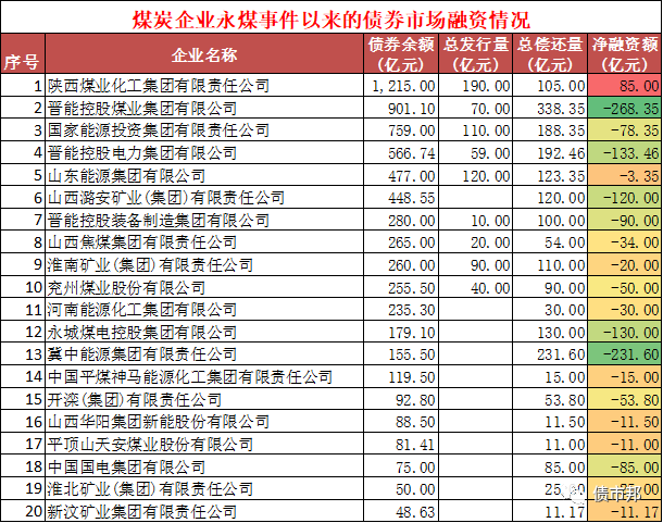 自永煤事件以來,煤炭企業(yè)的債券市場再融資受到了嚴重沖擊,債券余額排名前20的煤炭企業(yè),除了陜西煤化工還能實現(xiàn)凈融資外,其余19家煤炭企業(yè)的債券市場凈融資額均為負。除了我們熟知的剛兌猛男冀中能源外,晉能控股同樣表現(xiàn)不俗,凈償還額268億元比冀中能源的231億還要多。