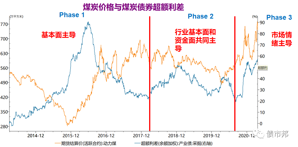 回顧2013年以來的行情,煤炭債券的超額利差主要經(jīng)歷了三個階段。