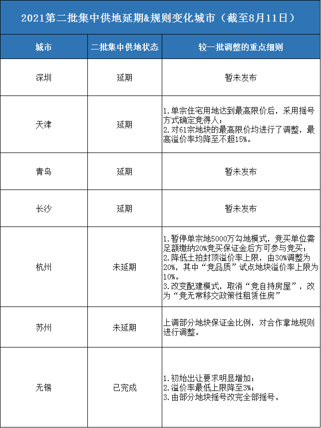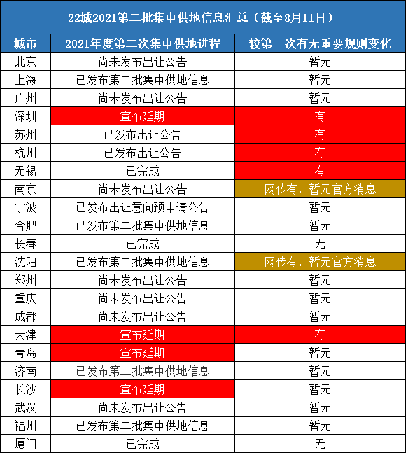 “補丁”來的很迅速。在22城2021年第一批推地全部完成,很多城市第二批箭在弦上的時間節(jié)點上,8月11日,自然資源部召開閉門會議,明確二批次核心城市土地出讓政策調(diào)整。在會議召開前后,一些熱點城市地方政府也紛紛開始跟進,或宣布第二輪供地延期,打磨政策“補丁”,或直接推出調(diào)整方案。