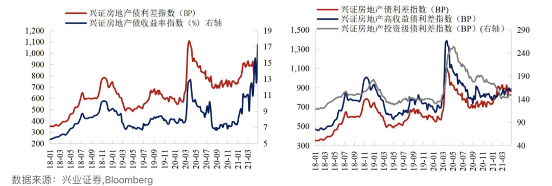今年以來,興證房地產債利差指數闊升至過去三年來的次高水平,僅次于2020年3月美元荒,結構上主要受到高收益級(垃圾債)利差走闊的抬升。信用利差是債券到期收益率高于無風險收益率的部分,直觀地反映了債券信用違約風險(與利差正比)及市場風險偏好(與利差反比)的變化。