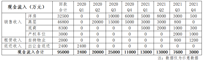 就項目本身來說,現金流入體現的是每一時刻下的流入項合計,即銷售回款流入、經營租賃流入和政策返還類流入合計;聯動的各項基礎數據包括業態指標、銷售單價與去化、回款等。