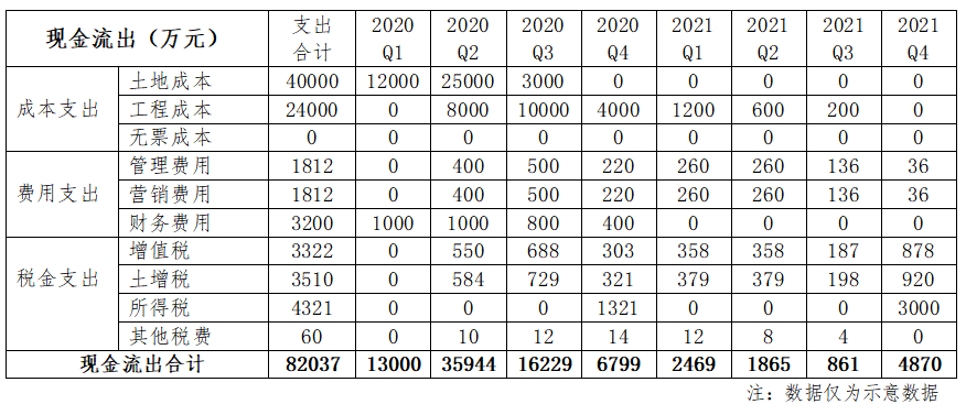 為保證項目正常獲取、開工建設及開盤銷售,需在不同交易進度、銷售進度和工程形象進度下支付不同比例的成本費用稅金,合計每一時刻下的支出合計形成相應的現金流出。