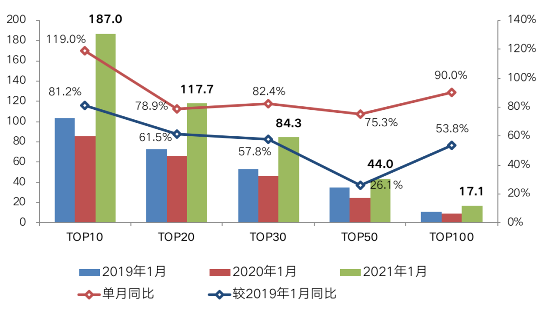 在2020年末熱點城市翹尾行情熱度延續的帶動下,2021年1月,多梯隊房企銷售業績門檻值相較去年和前年同期均有不同幅度的提升。TOP100房企銷售操盤金額的入榜門檻為17.1億元,較2020年1月同比增長90.0%,較2019年1月同比增長53.8%。