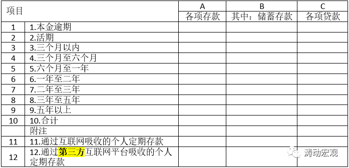 需要特別提及9號文指出的“應當在個人存款項目下單獨設置互聯網渠道存款統計科目”這一要求,實際上G0104《存貸款明細報表(二)》已經對此進行了更新(具體如下表),即增加了兩個科目,分別為通過互聯網吸收的個人定期存款(包括自營互聯網平臺)、通過第三方互聯網平臺吸收的個人定期存款: