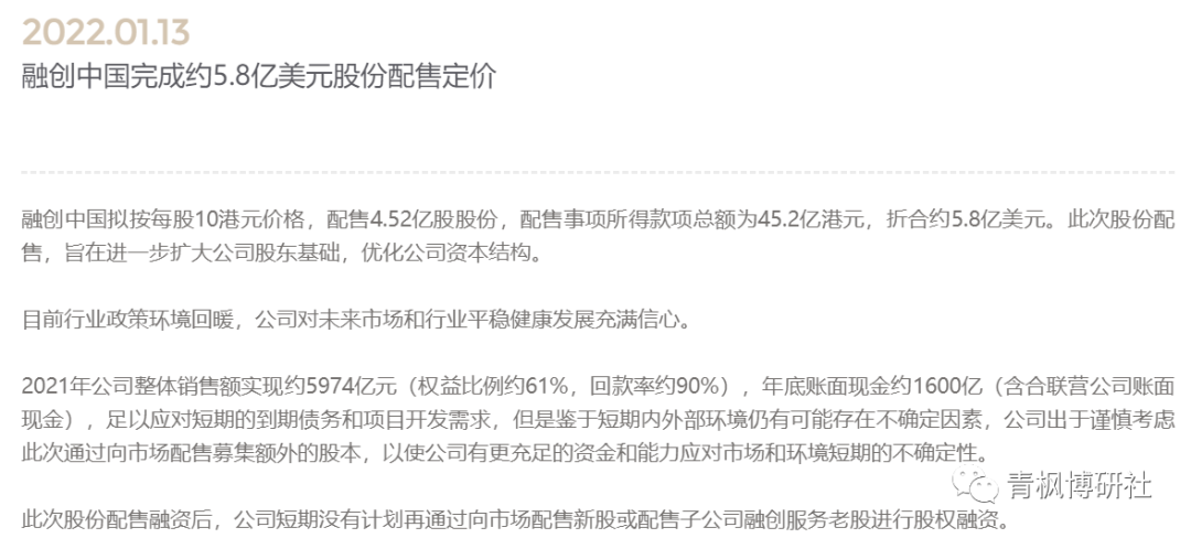 2022年1月13日,融創(chuàng)中國發(fā)布公告稱,其以10港元/股的對價配售4.52億股股份,配售所得款項(xiàng)總額為45.20億港元(折合美元約5.80億)。不過這次配股的價格相較于2021年11月13日的15.18港元/股折價幅度達(dá)34.12%,相較于2022年1月11日的收市價折價幅度則達(dá)到15%。據(jù)融創(chuàng)自身披露,其擬將配售所得款項(xiàng)的50%用于公司一般運(yùn)營,另50%用于償還貸款。