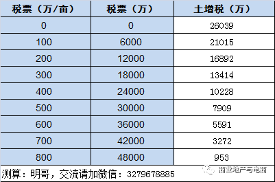 測(cè)算結(jié)果是應(yīng)繳土增稅7909萬(wàn)。接下來(lái)我們?cè)诓煌亩惼苯痤~假設(shè)下,測(cè)算土增稅和凈利率是如何隨著稅票變動(dòng)的。