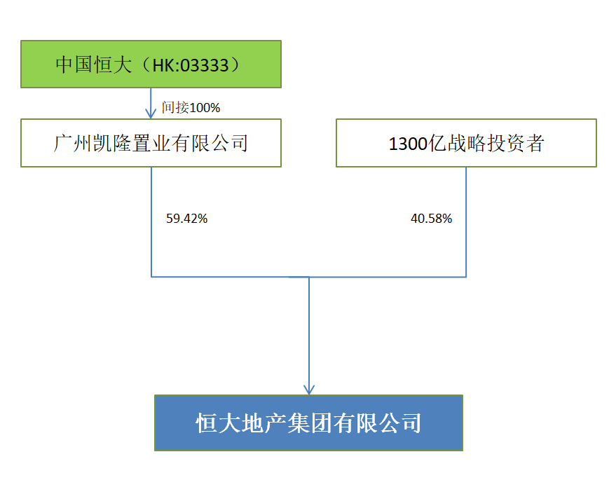主要的區(qū)別在于,恒大集團(tuán)1300億的戰(zhàn)投資金并不是投在上市公司本級(jí),而是投在上市公司下屬子公司恒大地產(chǎn)集團(tuán)有限公司(以下稱“恒大地產(chǎn)”),戰(zhàn)投占恒大地產(chǎn)40.58%的權(quán)益。