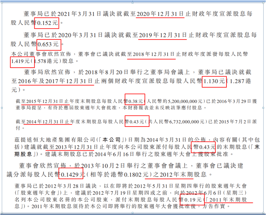 這是恒大集團(tuán)合并報(bào)表范圍內(nèi)分紅的現(xiàn)金總支出,與作為上市公司的中國(guó)恒大(HK:03333)的股東分紅有一定的區(qū)別。