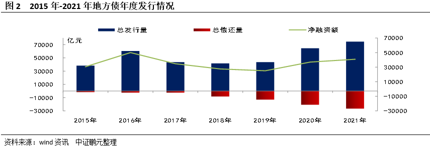 2021年上半年,由于國內經濟處于穩增長壓力最小窗口期,地方政府債券發行規模有所收縮,但下半年穩增長重要性上升,地方債發行明顯加快。具體來看,2021年,我國境內地方債共發行1,991只,同比增長7.74%,規模74,826.30億元,同比增長16.12%,無論發行只數還是發行規模均達到了地方債自發行以來的高峰。從償還情況來看,2021年總償還規模26,684.66億元,同比增長28.50%,創下自地方債發行以來新高,實現凈融資48,141.65億元,同比增長10.21%,僅次于2016年的5.8萬億元。