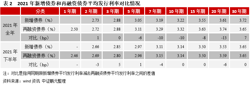 3、同期限新增債券平均發行利率整體低于再融資債券。2021年,除2年期和30年期,新增債券平均發行利率整體低于再融資債券。具體來看,2年期和30年期新增債券平均發行利率高于同期限再融資債券1BP和7BP,3年期持平,5年期、7年期、10年期、15年期和20年期新增債券平均發行利率低于同期限再融資債券,分別低于6BP、10BP、10BP、8BP、13BP。但下半年同期限新增債券平均發行利率與再融資債券相比有高有低,其中,3年期、5年期新增債券平均發行利率高于同期限再融資債券,分別高于5BP和1BP,2年期、7年期和20年期新增債券平均發行利率低于同期限再融資債券,分別低于3BP、4BP、6BP。