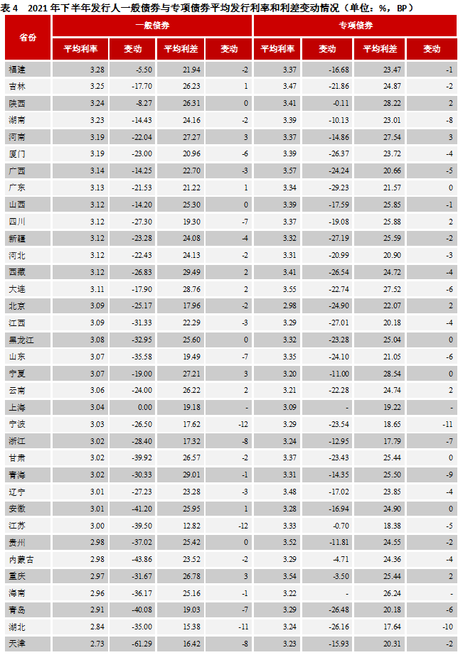 5、一般債券和專項債券平均發行利率整體下行,發行利差以下行為主。2021年下半年,地方債一般債券發行人平均發行利率最高的為福建,為3.28%,其次為吉林,為3.25%,再者為陜西,為3.24%;平均發行利率最低的為深圳,為2.66%,其次天津,為2.73%,再者湖北,為2.84%。地方債專項債券發行人平均發行利率最高的為廣西,為3.57%,其次為大連,為3.55%,再者為重慶,為3.54%;平均發行利率最低的為北京,為2.98%,其次上海,為3.09%,再者寧夏,為3.20%。2021年下半年,地方債一般債券發行人平均利差最高的為西藏,為29.49BP,其次為青海,為29.01BP再者大連,為28.76BP,最低的為江蘇,為12.82BP,其次湖北,為15.38BP,再者天津,為16.42BP;專項債券平均利差最高的為寧夏,為28.54BP,其次陜西,為28.22BP,再者為河南,為27.54BP,最低的為湖北,為17.64BP,其次浙江,為17.79BP,再者江蘇,為18.38BP。2021年下半年,深圳、北京等地經濟財政實力較強,發行利率仍然較低,湖北由于經濟財政增速較好,發行利率也相對較低,而廣西等地由于下半年公共財政收入增速較低,發行利率相對較高。