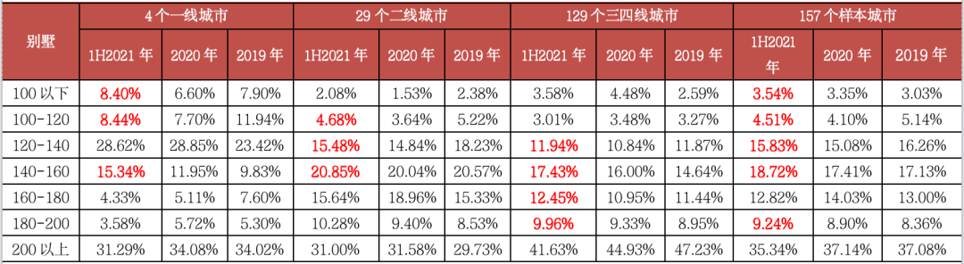 一線城市80-120平方米、140-160平方米緊湊型別墅成交最為活躍。二線城市90-160平方米別墅悄然流行,2021年上半年成交占比達到42.16%,而160-180平方米別墅去化表現不暢,成交占比跌至15.64%,較2020年減少3.32個PTS。三四線城市120-200平方米別墅去化表現搶眼,2021年上半年成交占比升至51.78%,較2020年增長4.66個PTS。200平方米以上大戶型別墅銷售遇冷,成交占比由2019年的47.23%降至2021年上半年的41.63%,累計跌幅達5.6個PTS。