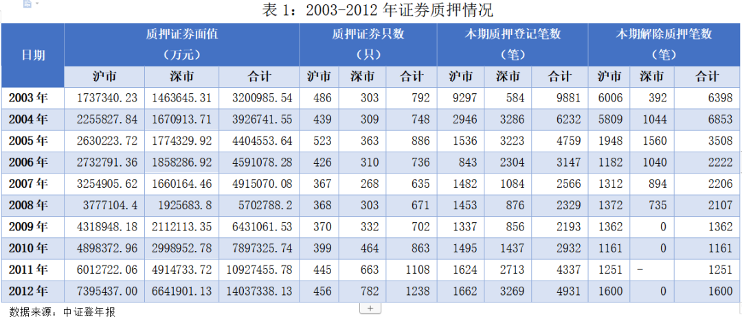 由上表可以看出滬市的質(zhì)押量和質(zhì)押規(guī)模總體上略多于深市,但2011、2012深市證券質(zhì)押數(shù)量大幅上漲。這時候市場上的股票質(zhì)押基本都屬于場外質(zhì)押,股票質(zhì)押相當(dāng)于貸款的一種增信手段。