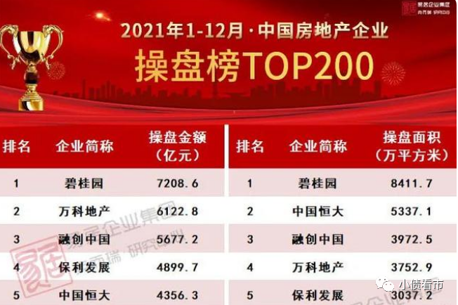據克而瑞數據,2021年碧桂園以7208.6億操盤金額和8411.7萬平方米操盤面積,第五年在房企中稱霸。