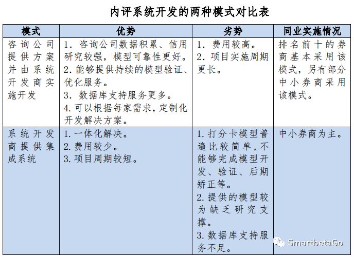 由于證券公司存在數據缺失和內部研究能力不足等問題,目前證券行業實施內部信用評級系統建設主要采用以下兩種模式:一是咨詢公司提供咨詢方案并由系統開發商實施開發的模式,業內排名靠前的大券商普通采用該種模式;二是系統開發商提供集成系統的模式,中小券商較多采用該模式。上述兩種主要模式的對比情況詳見下表: