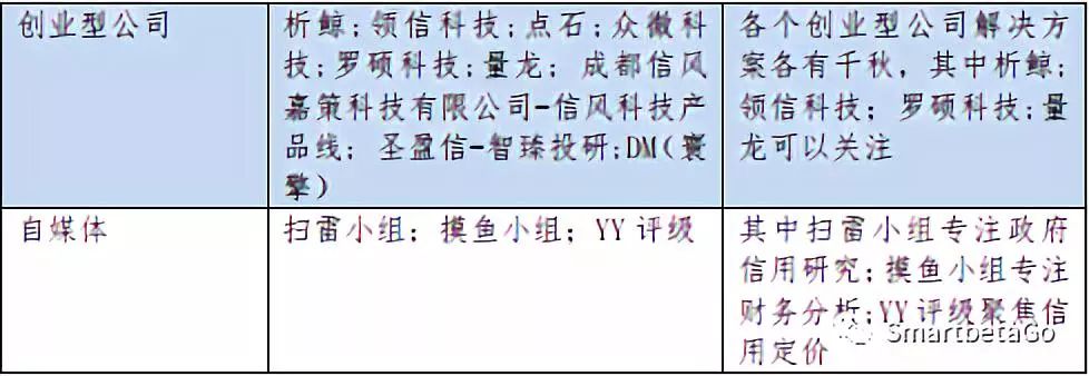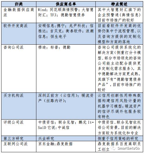 隨著信用債市場違約的爆發,2018年信用債違約120只,涉及金額1176.51億元,創下2014年債券違約元年以來的最高值:數量上,120只與前4年總和(2014年-2017年)122只幾乎持平;規模上,1177億元比前4年總和860億元高出約36.9%。信用債違約的爆發一方面催生了買方對信評的崗位需求,另一方面也催生出眾多針對信用債領域的各個方面的解決方案提供商,筆者對這些提供商進行了全市場調研和歸類,如下: