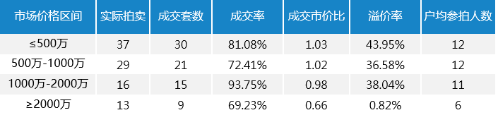 根據上述統計,95套住宅中在500萬內這個價格區間房源最多為37套,占本月實際上拍房產的38.95%,成交市價比超過1。本月法拍住宅火熱程度不減,除市價高于20000萬的房產,成交都接近市價或高于市價,這種現象一是表明法拍房接受度更高,法院執行情況更好,其次是法拍稅費單一相比還是更具有價格優勢。綜上三月的折扣率偏高與上拍量及房屋質量有很大關系。