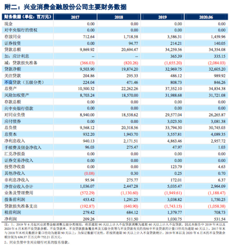 說明書顯示,截至2017年、2018年、2019年末和2020年6月末,興業消費金融貸款余額分別為98.70億元、206.94億元、342.60億元和343.54億元。