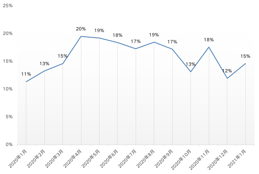 圖:2020-2021年1月重點城市涉宅地塊溢價率走勢(%、萬平方米、元/平方米)