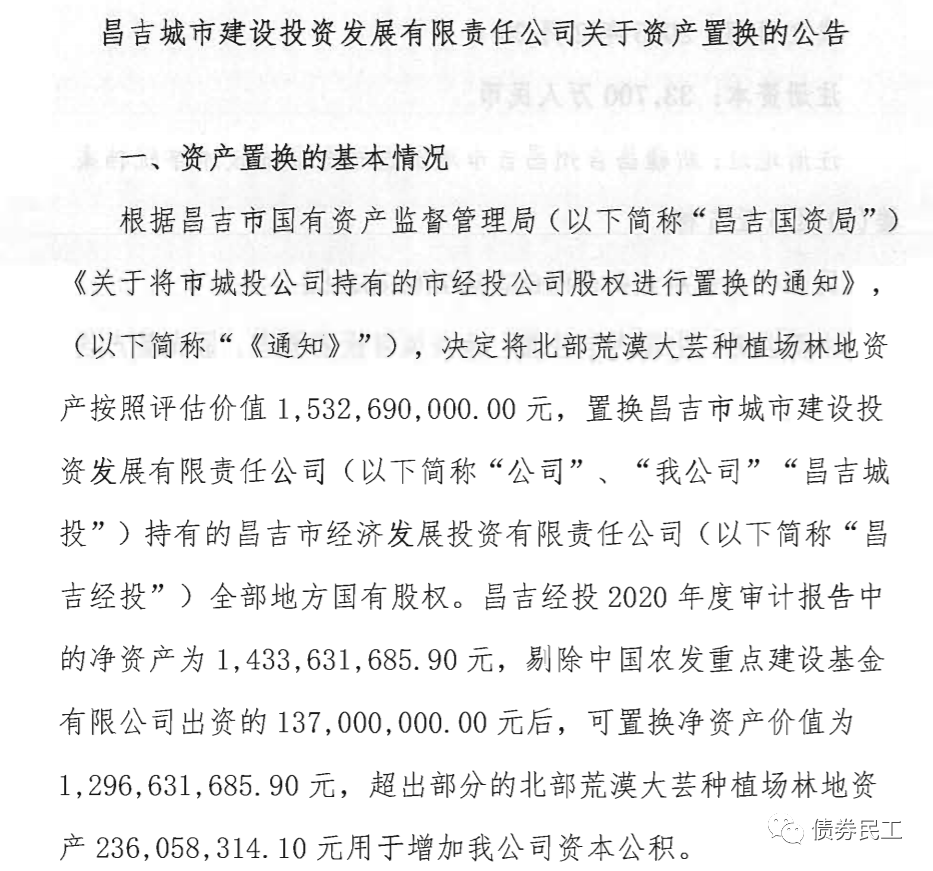 1、根據(jù)昌吉城市建設(shè)投資發(fā)展有限責任公司2021年9月23日發(fā)布的公告,擬將北部荒漠大蕓種植場林地資產(chǎn)用于置換公司的全資子公司昌吉市經(jīng)濟發(fā)展投資有限責任公司的股權(quán)。根據(jù)公告內(nèi)容,本次資產(chǎn)置換的主要目的是深化昌吉市的國有企業(yè)改革,調(diào)整優(yōu)化國有資本布局。公司的控股股東是昌吉市國有資產(chǎn)投資經(jīng)營有限責任公司,實際控制人是昌吉市國有資產(chǎn)監(jiān)督管理局。公司的主體信用評級為AA,存續(xù)債券金額為14.80億元。