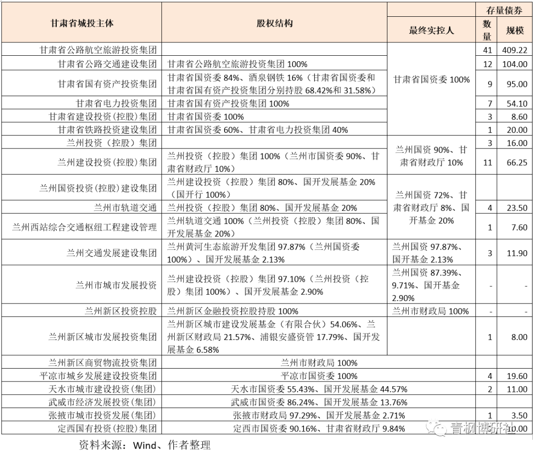 (1)層級(jí)上看,省級(jí)平臺(tái)均為甘肅省國(guó)資委最終100%控股,蘭州市級(jí)平臺(tái)穿透后要么為甘肅省國(guó)資委控股,要么為蘭州市國(guó)資委控股。