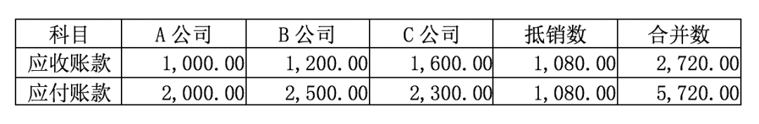 舉例:A、B、C三家公司合并破產重整,應收賬款賬面數據分別為1000萬元、1200萬元、1600萬元,應付賬款賬面數據分別為2000萬元、2500萬元、2300萬元。其中A公司對B公司應收200萬元,A公司對C公司應收380萬元,C公司對B公司應收500萬元,此時關聯方之間的債權、債務合計為1080萬元,合并后的債權、債務僅體現對非合并范圍內關聯方及非關聯方的數據,合并后數據如下: