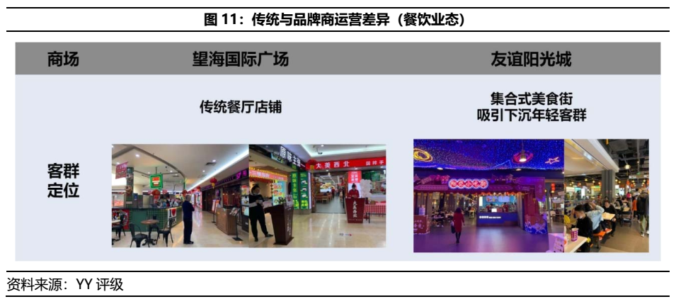 短平快模式在商鋪業態占比上,以高占比的餐飲店鋪和品牌集合購物店鋪為主,吾悅廣場和友誼陽光城的餐飲店鋪占比分別為39.38%和37.42%。而較為可惜的是華潤N次方受限于其作為2萬平米(一般小型社區型商業物業約3萬平米)的商業配套建設,過少的商鋪導致其往常人流不濟,盡管其餐飲店鋪的占比高并鎖定于年輕下沉市場。