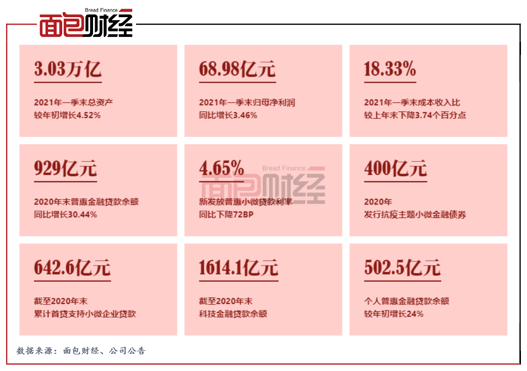 截至2020年末,該行人行口徑普惠金融貸款余額達到929億元,同比增加217億元,增幅達30.44%,增量增速均創近三年新高。新發放普惠小微貸款利率為4.65%,同比下降72BP。