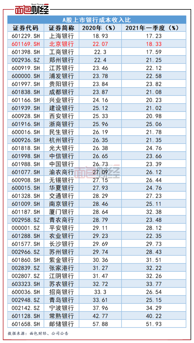 業績增長的同時,北京銀行加強了成本管理,優化了費用結構,該行成本收入比持續下降。2020年,該行的成本收入比為22.07%,較上年同期下降1.16個百分點。2021年一季度,該行的成本收入再次下降3.74個百分點至18.33%。與其他上市銀行相比,北京銀行的成本收入比較低,經營效率較高。