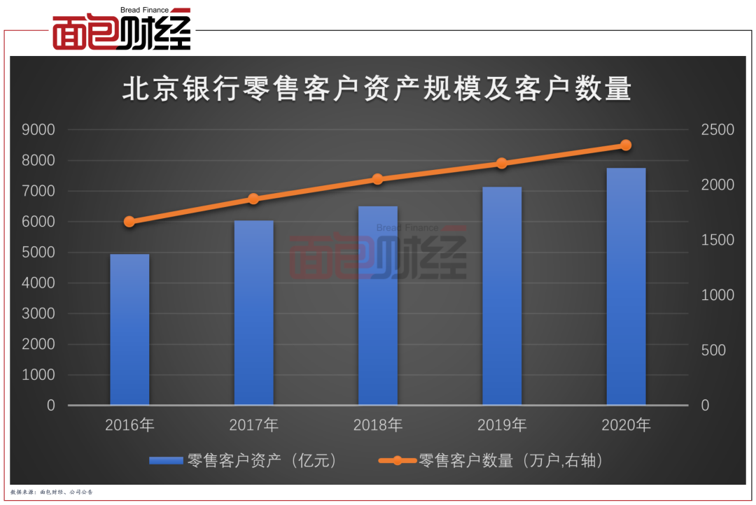 截至2020年末,北京銀行管理的零售客戶資產達到7748億元,較年初增長612億元。零售存貸款規模分別為3925億元和5050億元,較上年同期分別增加404億元和623億元,增幅分別為11.5%和14.1%。零售客戶達2357.9萬戶,較年初增長163.7萬戶,增幅為7.4%