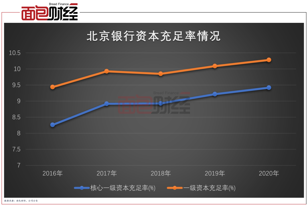 數據顯示,截至2020年末,北京銀行核心一級資本充足率、一級資本充足率及資本充足率分別為9.42%、10.28%和11.49%,均滿足監管要求。