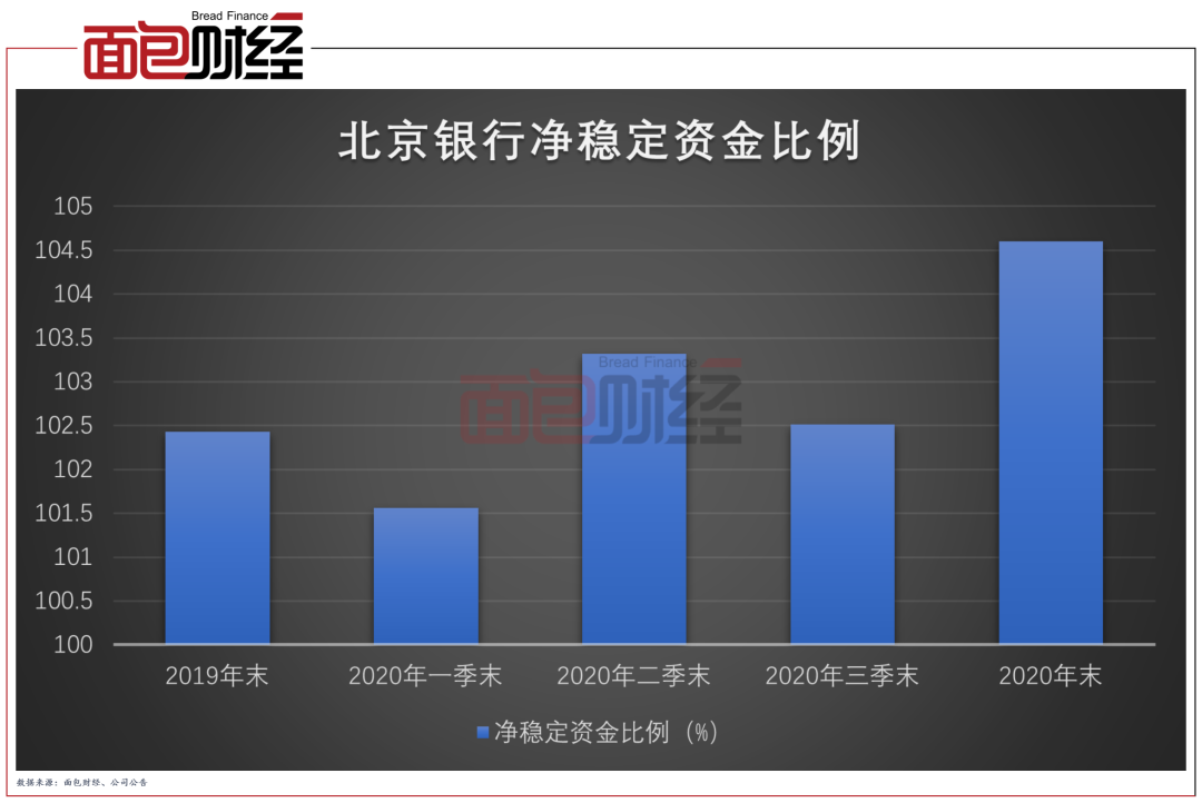除了資本方面,流動性風險管理對于銀行來說也越來越重要。截至2020年末,北京銀行的凈穩定資金比例為104.60%,較上年末增加2.17個百分點。