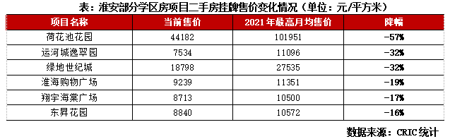 以學(xué)區(qū)房為代表的二手房房?jī)r(jià)是淮安樓市預(yù)期和購(gòu)房情緒的關(guān)鍵。2021年8月起二手房市場(chǎng)出現(xiàn)劇烈調(diào)整,學(xué)區(qū)房?jī)r(jià)格腰斬。