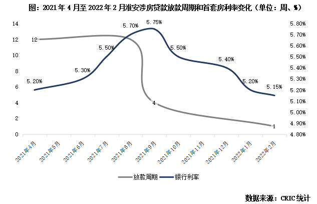 至2022年3月,淮安涉房信貸已寬至近年新低。銀行信貸資金充裕,房貸放寬周期縮短至一周。首套房利率由高點(diǎn)5.75%降至5.15%。