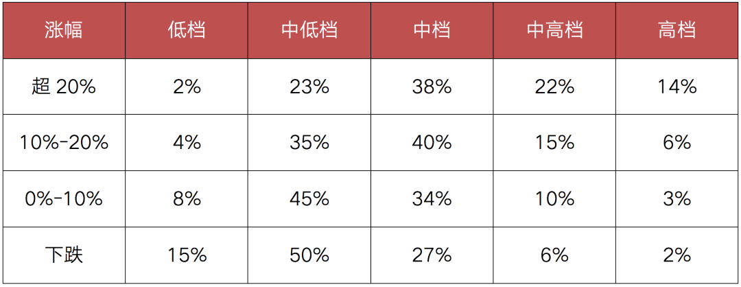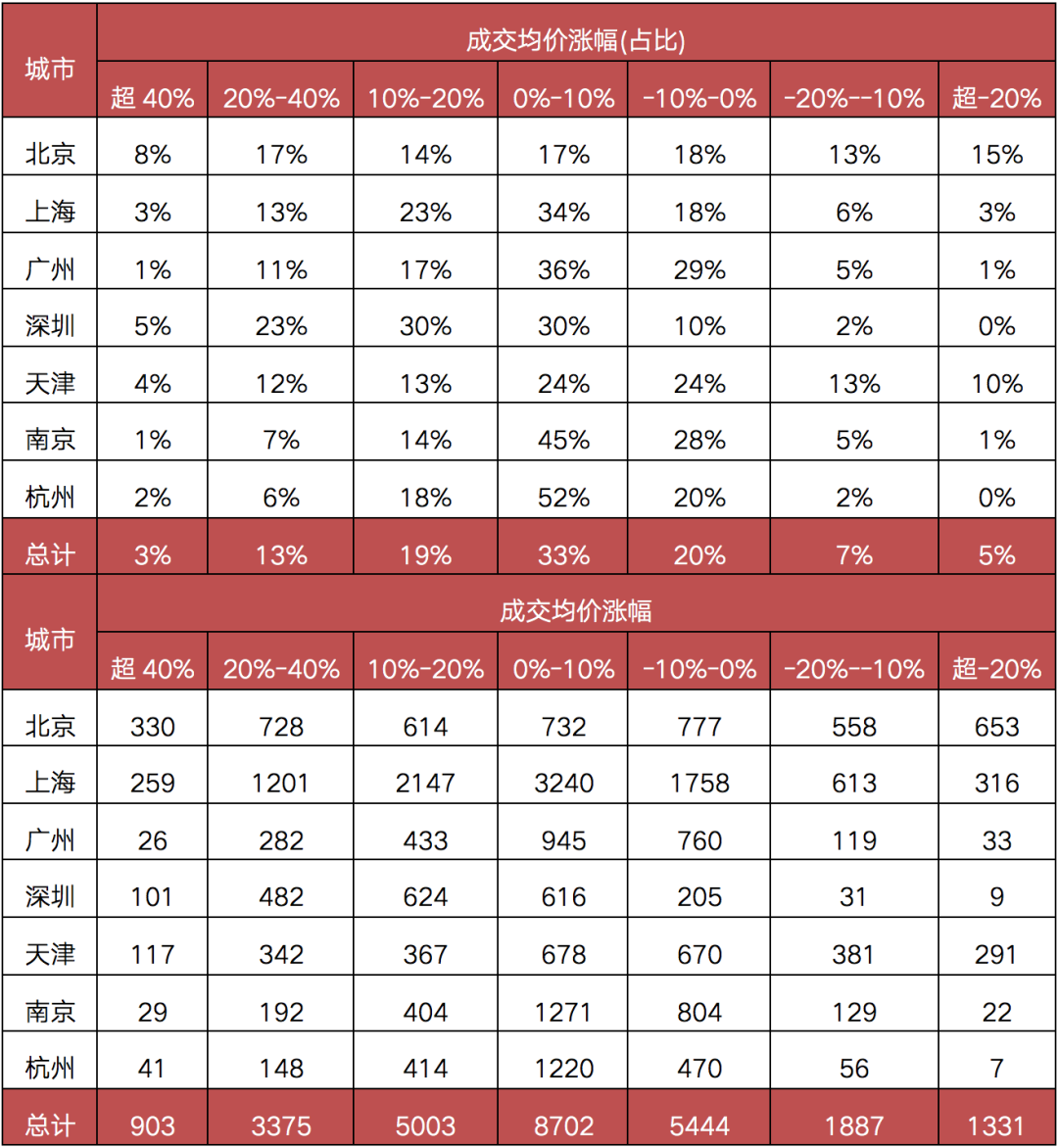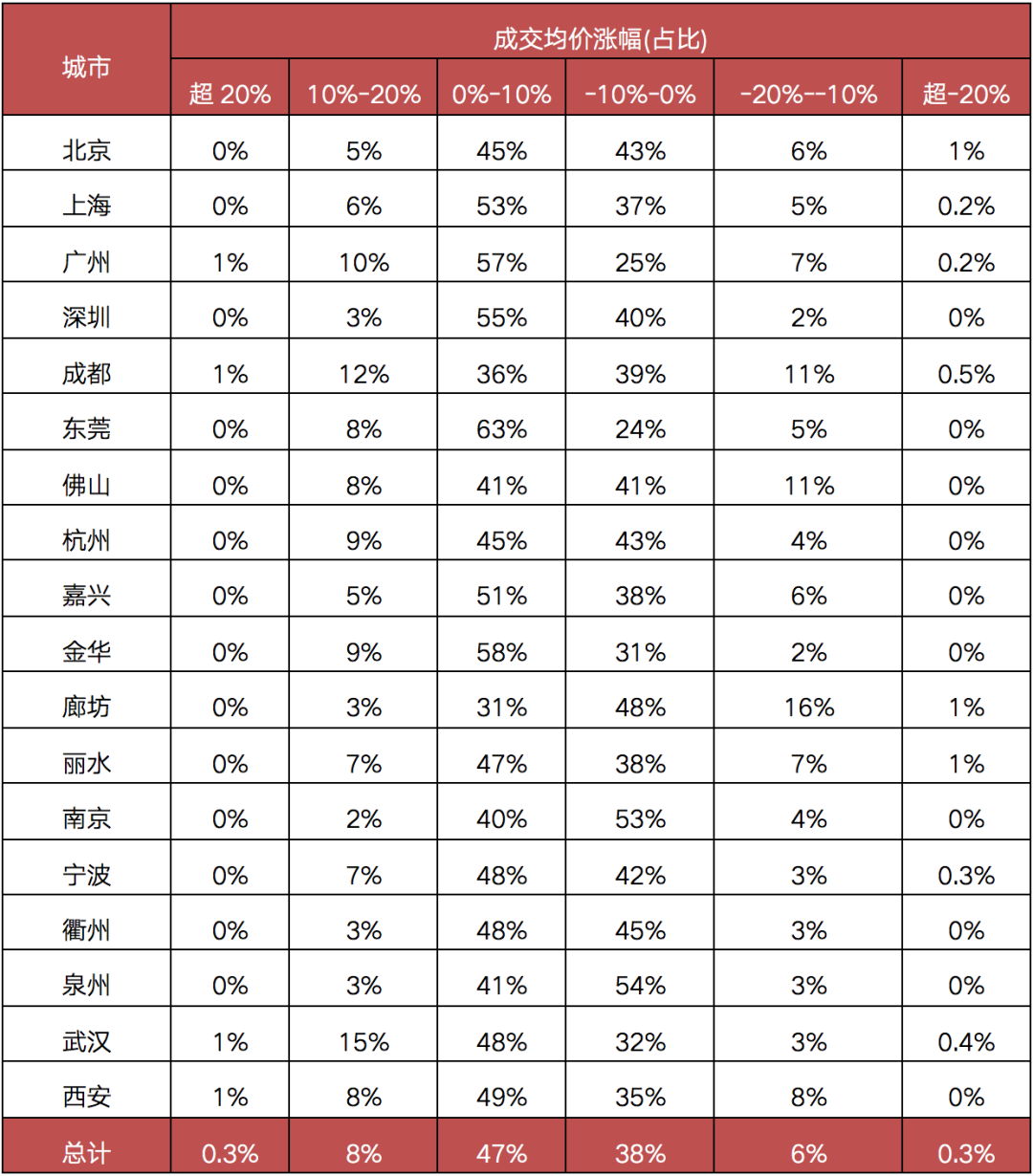 正是由于房?jī)r(jià)漲幅超20%、40%的小區(qū)具有較高占比,因此市場(chǎng)直觀感受中房?jī)r(jià)“漲聲”一片。