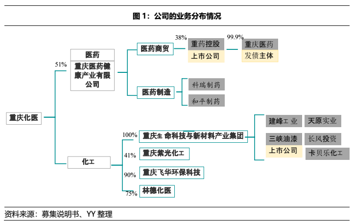 公司有醫(yī)藥、化工兩大板塊,醫(yī)藥板塊以醫(yī)藥流通為主,有少量的醫(yī)藥制造,均已被整合至重慶醫(yī)藥健康產業(yè)有限公司體內,醫(yī)藥板塊已經形成較為獨立的整體,有自己的發(fā)債平臺、上市融資平臺,融資和經營都較為獨立。