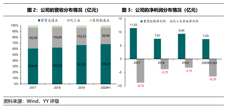 公司的營業(yè)收入主要由醫(yī)藥商貿和化工構成,但是凈利潤主要來源于醫(yī)藥商貿,化工板塊雖然營收體量不小,但是常年處于虧損狀態(tài),成為集團的包袱。
