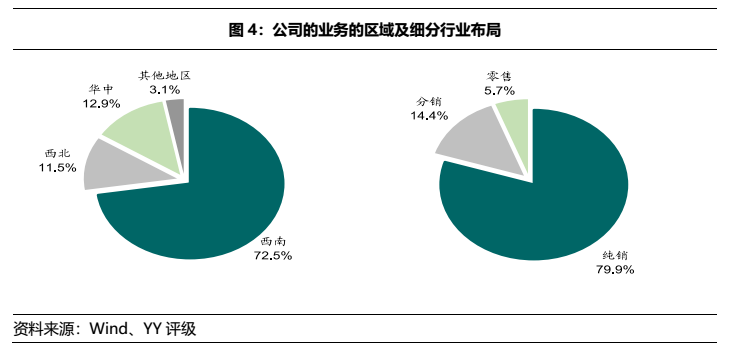 重慶醫(yī)藥是重慶最大的醫(yī)藥流通企業(yè),深耕西南地區(qū),業(yè)務以純銷(約80%)、藥品銷售(90%+)為主。