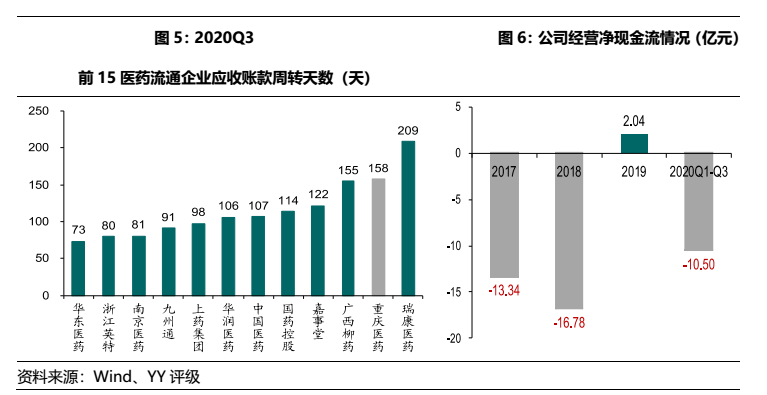 從資產端來看,負債主要變?yōu)榱藨召~款,雖然回收風險較小,但運營效率較低。由于公司加大醫(yī)院客戶的開發(fā)力度,所以16-2020Q3新增的有息債務143億,主要轉為了應收賬款(新增180億)和存貨(新增41億),應收賬款主要為醫(yī)院客戶所欠貨款,以一年內到期居多(95%+),所以回收風險小,但是應收賬款周轉天數不斷攀升,截至2020Q3已經高達158天,加劇現金流的吃緊,2017-2020Q3公司經營凈現金流分別為-13.34、-16.78、2.04、-10.5。