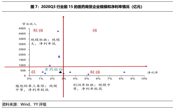 重慶醫(yī)藥處于進退兩難的尷尬處境。公司的規(guī)模沒有4家全國性藥企大,利潤率沒有華東醫(yī)藥等區(qū)域性藥企高,處于尷尬的第三象限。此時,選擇擴張?則利潤率可能會進一步下滑,盈利能力可能進一步惡化,原來就不富裕的現金流雪上加霜;不擴張?則面臨4大龍頭侵蝕市場份額,也無法突圍,就像掉進了中產階級陷阱,騎虎難下,較難突圍。
