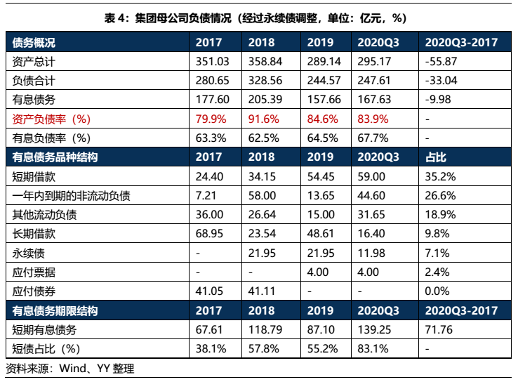 所以目前集團的問題也是杠桿率高企、債務期限結構惡化,債務規(guī)模較大,但賬上現金捉襟見肘,截至2020Q3末,公司短債已經到達383億,而貨幣資金只有64億,貨幣資金對短債的覆蓋率不到17%,償付壓力極大。