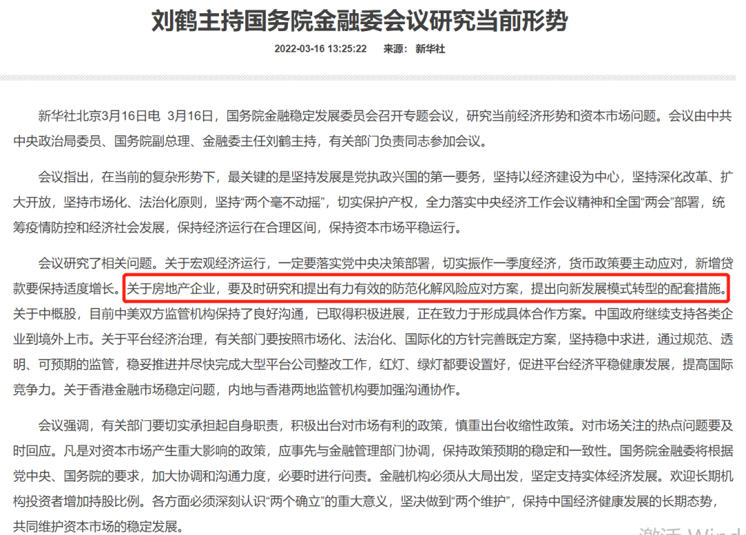 國務院金融委:及時研究和提出有力有效的防范化解房地產風險應對方案。有關部門要切實承擔起自身職責,積極出臺對市場有利的政策,慎重出臺收縮性政策。對市場關注的熱點問題要及時回應。