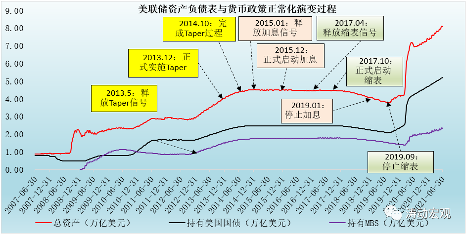 前面已經(jīng)指出,美聯(lián)儲的貨幣政策正常化路徑基本上遵循“向市場釋放Taper信號——Taper過程——向市場釋放加息信號——加息——向市場釋放縮表信號——正式縮表”的邏輯脈絡(luò)。