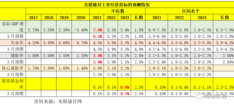 (1)上調(diào)了美國未來三年的經(jīng)濟增長預(yù)期,預(yù)計2021-2023年的實際經(jīng)濟增速(中位數(shù))分別為7%、3.3%和2.40%,相較于今年3月(中位數(shù))預(yù)期的6.50%、3.30%和2.20%有一定上升。同時預(yù)計長期經(jīng)濟增速為1.80%(中位數(shù))。