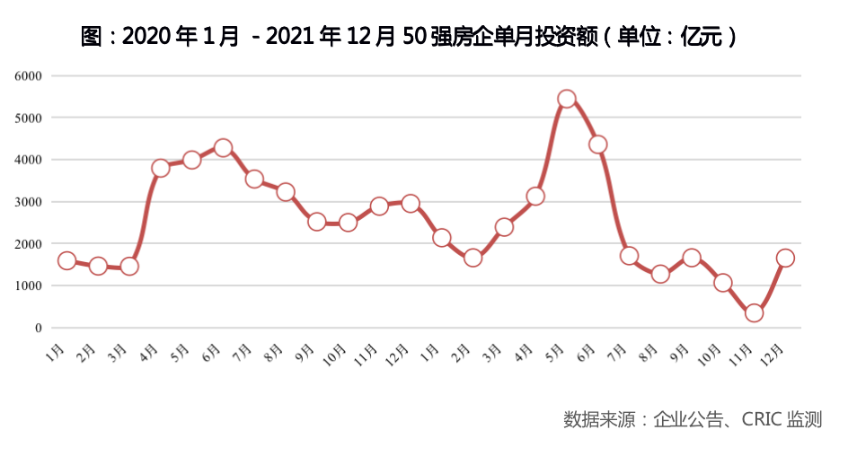 從銷售50強房企單月投資力度的變化來看,全年呈現“先揚后抑”的走勢。5-6月份是房企拿地的窗口期,在首輪集中供地的帶動下,50強房企單月投資額最高達到5445億元,創2020年以來新高,也是全年投資力度最高峰。